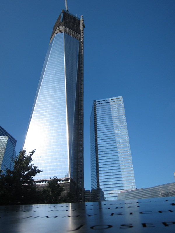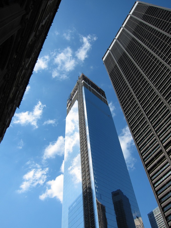Nous continuons notre route vers le site de Ground Zero. Un Memorial est actuellement en construction mais le site est ouvert au public. Quelques cicatrices restent visibles mais le plus gros est nettoyé et la reconstruction bât son plein. Deux tours (sur les 4 prévues) sont déjà sorties de terre reflétant le ciel sur leurs façades vitrées.